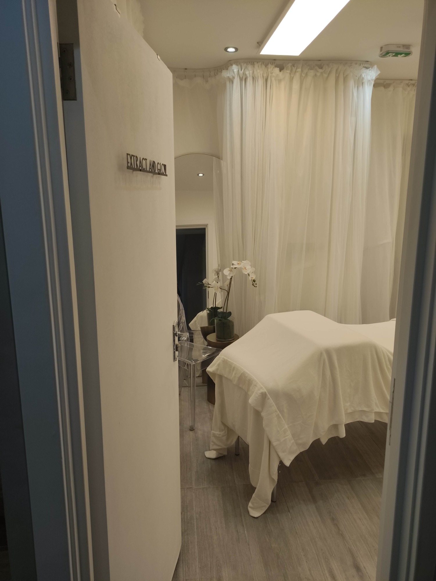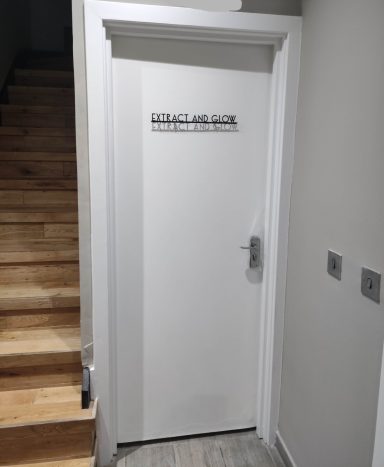 Take a closer look at our treatment room. Step inside the barber shop, and you’ll notice the stairs leading down to the basement. Once you descend to the lower level, our door will be at the end of the corridor, clearly marked with our sign. This professional setup makes Extract and Glow the perfect choice for your facial therapy needs. Our dedicated team ensures that every moment you spend with us is filled with comfort, offering treatments that rejuvenate both your skin and your spirit.